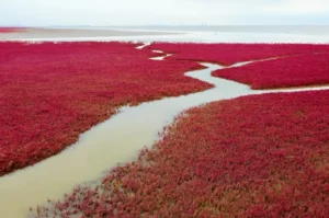 يقع هذا الشاطئ في منطقة بانجين بالصين، وهو مغطى بنوع من الطحالب يسمى “سويدا” يتحول لونها إلى أحمر لامع في فصل الخريف.