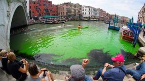 ظهرت بقعة من السائل الأخضر الفسفوري الذي ظهر في القناة الكبرى في البندقية بسبب مادة الفلورسين الكيميائية.