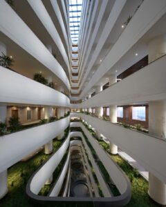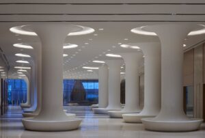 قالت Morphogenesis أن تصميمها يخلق “ساحة لعب متكافئة” للشركات الصغيرة والكبيرة على حد سواء. مع وجود مكاتب متصلة بواسطة ممر مركزي طويل – وهو تكوين يذكرنا بمحطة المطار – يتمتع الركاب بوصول مريح مماثل إلى وسائل الراحة والمرافق ، وفقًا للمؤسس المشارك لشركة الهندسة المعمارية ، سونالي راستوجي ، الذي وصف التصميم بأنه “ديمقراطي”.